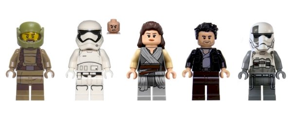 Inclusief 5 minifiguren: kapitein Poe Dameron, Rey, een Resistance Trooper, een First Order Walker Driver en een First Order Stormtrooper.